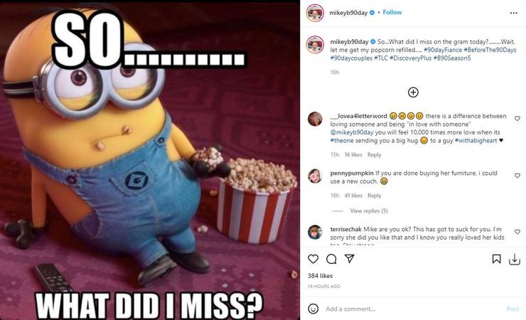 Un espectador de 90 Day Fiancé escribió: “ ¡Te extrañamos en el gramo hoy, Mikey! Mike les respondió con un comentario críptico: “ ¡Gracias! Por lo que veo no me está gustando. Otro espectador de TLC preocupado le preguntó: " Mike, ¿estás bien? Esto tiene que apestar para ti. Lamento que te haya hecho eso y sé que realmente amabas a sus hijos también. Mantente fuerte .” Mike dijo de manera tranquilizadora: “ Estoy bien y me sorprendió lo que veo. A partir de ahora, Mike ha ignorado los comentarios que dicen cosas como: "Atrapamos a tu chica con un hombre nuevo " y " Runnnnnn. Ella parece estar haciendo trampa. Mientras tanto, Ximena aparentemente le dio una bloguera a 90 Day Fiancévarias excusas (compartidas por John Yates ) sobre por qué había publicado el TikTok, incluido cómo el video es falso, alguien le robó el teléfono y que fue antes de Mike.