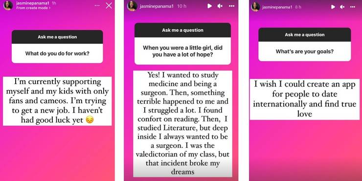 Jasmine se tomó un descanso repentino de Instagram después de publicar sobre por qué perdió su trabajo como profesora de literatura estadounidense y no ha vuelto a su cuenta @jasminepanama desde entonces. Pero con la esperanza de comenzar de nuevo, Jasmine ahora comenzó a usar una página de respaldo, @jasminepanama1, que creó con la intención de crear contenido relacionado con la salud y el estado físico. Mientras tenía una conversación íntima con sus seguidores de Instagram a través de una sesión de preguntas y respuestas, se le preguntó a Jasmine: " ¿Qué haces para trabajar? Jasmine respondió: “ Actualmente me apoyo a mí ya mis hijos solo con fans y cameos. ”